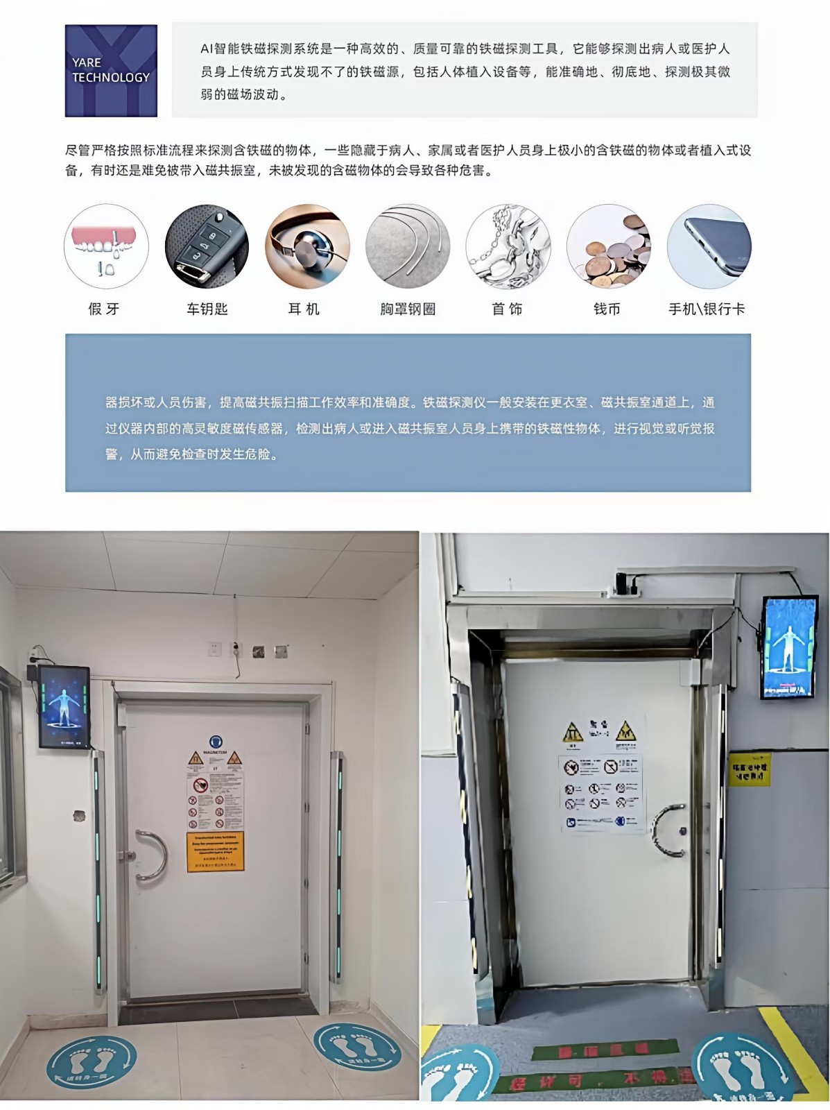 &需求分析:医院 MRI 室患者流量大,人员复杂,需要高效、准确地检测出进入人员身上携带的铁磁物体,保障设备安全和患者、医护人员的人身安全。