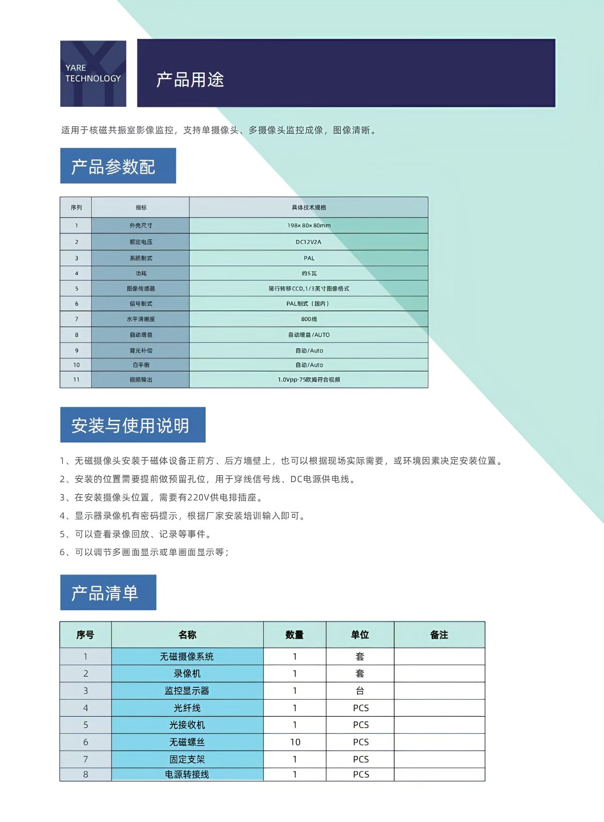 3、售后服务:建立完善的售后服务体系,提供 24 小时在线技术支持。定期对无磁摄像系统进行回访,检查系统运行状况,及时解决使用过程中出现的问题,如图像异常、设备故障等。根据技术发展和用户反馈,及时对系统软件进行升级,提升系统性能和功能,确保系统始终能够适应不断变化的医疗监控需求。同时,储备充足的备品备件,在设备出现故障时能够及时更换,缩短维修时间,保障监控系统的持续稳定运行。